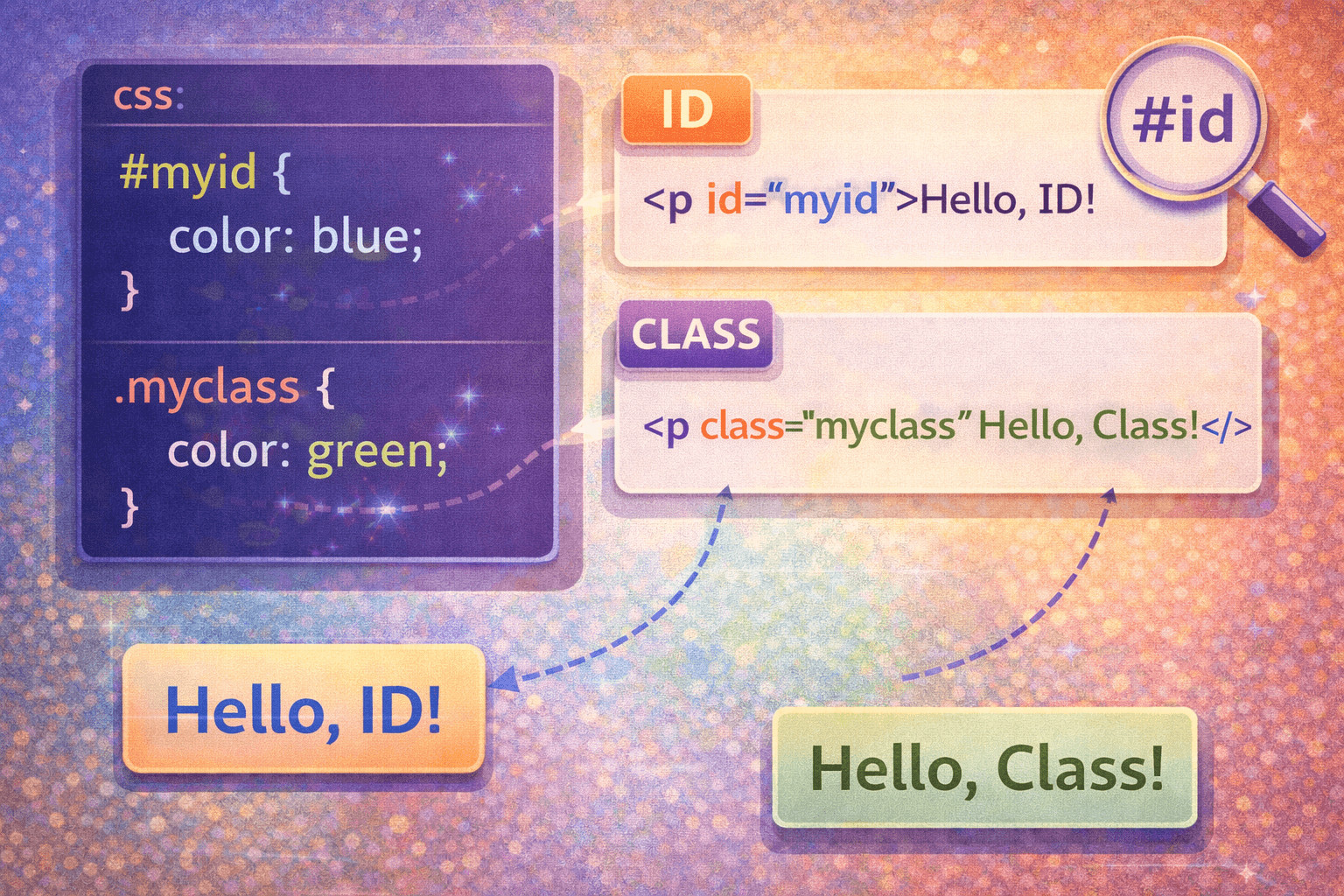 Подключение такое же, как и у атрибута «class», только вместо «class» пишется «id», а вместо точки перед именем стиля в css пишется #. А теперь подробно: Чтобы подключить стиль с помощью атрибута id(идентификатора), в файле .css пишется его название и внутри фигурных скобок{} указываются его свойства. Перед названием нужно поставить #, чтобы браузер понял, что стиль относится к id, а не к тегу.