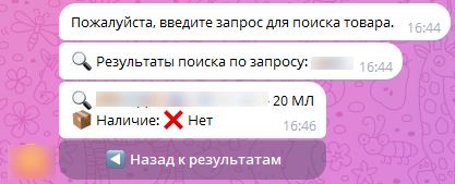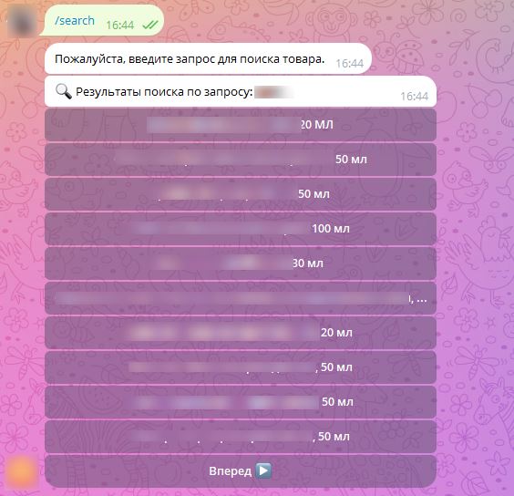 Основные команды для диллеров /search — поиск товара.Им нужно просто ввести название товара и ему подгрузятся первые 10 вариантов. Если нужно больше вариантов, то можно пролистывать. Пагинация сделана для удобства использования на мобильных устройствах.